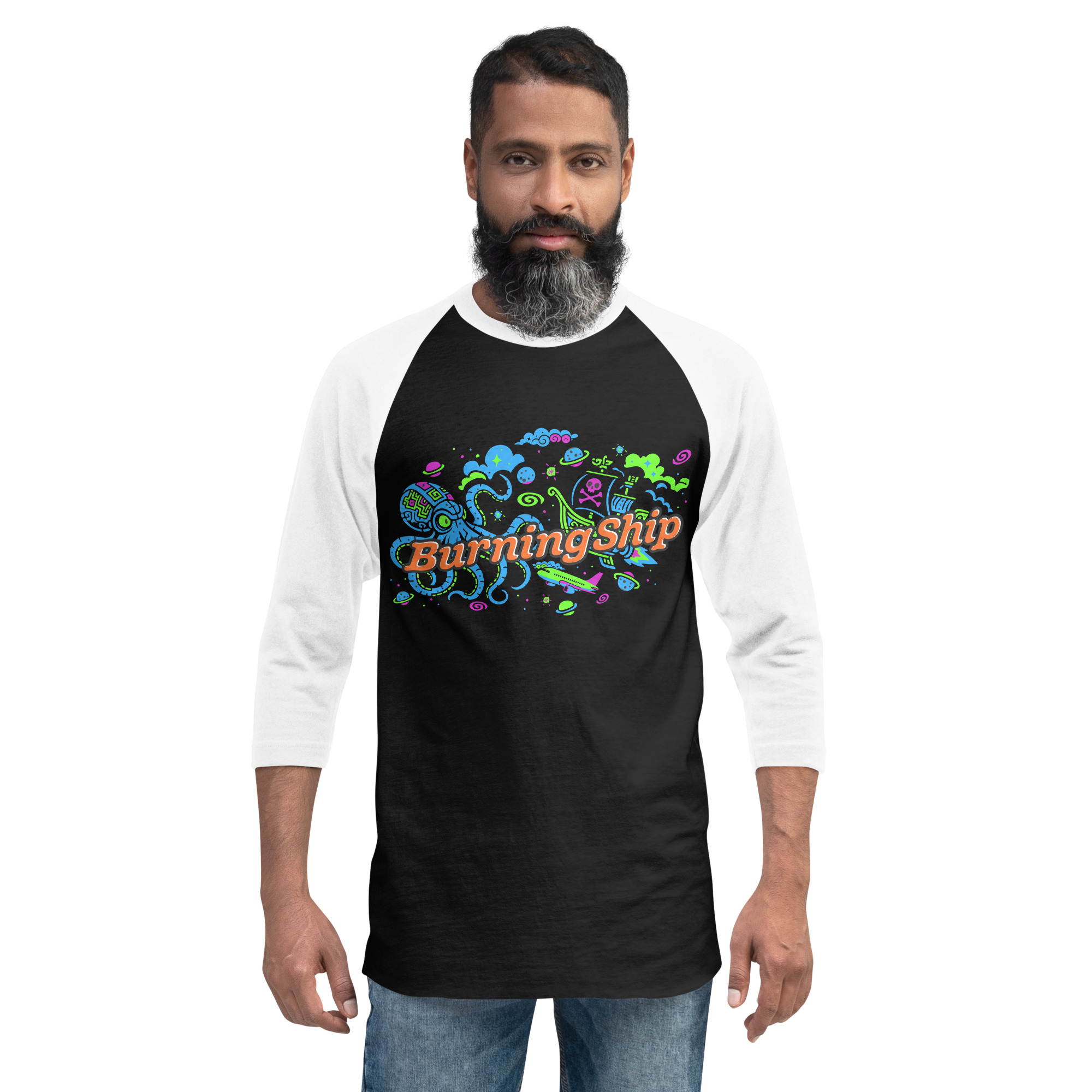 A battle for the skies and seas is brewing—and you’re on the crew. This classic black-and-white raglan tee features our camp’s signature chaos: a robot octopus locked in combat with a pirate ship, all while a commercial jet soars overhead. Why? Because at Burning Ship, we all fly for different airlines.